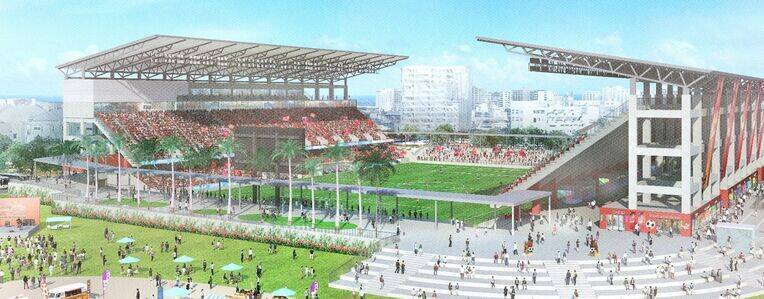 玉城デニー知事は26日の定例会見で、那覇市の奥武山公園内に整備するJリーグ規格のサッカー専用スタジアムの整備計画を公表した。観客席1万人規模のスタジアム整備費は264億円と試算。