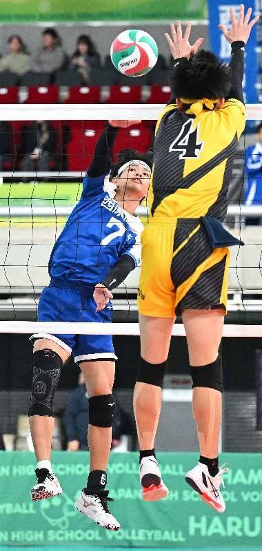 西原―新田 第1セット、スパイクを放つ長嶺結斗(左)=東京体育館(小笠原大介東京通信員撮影)">