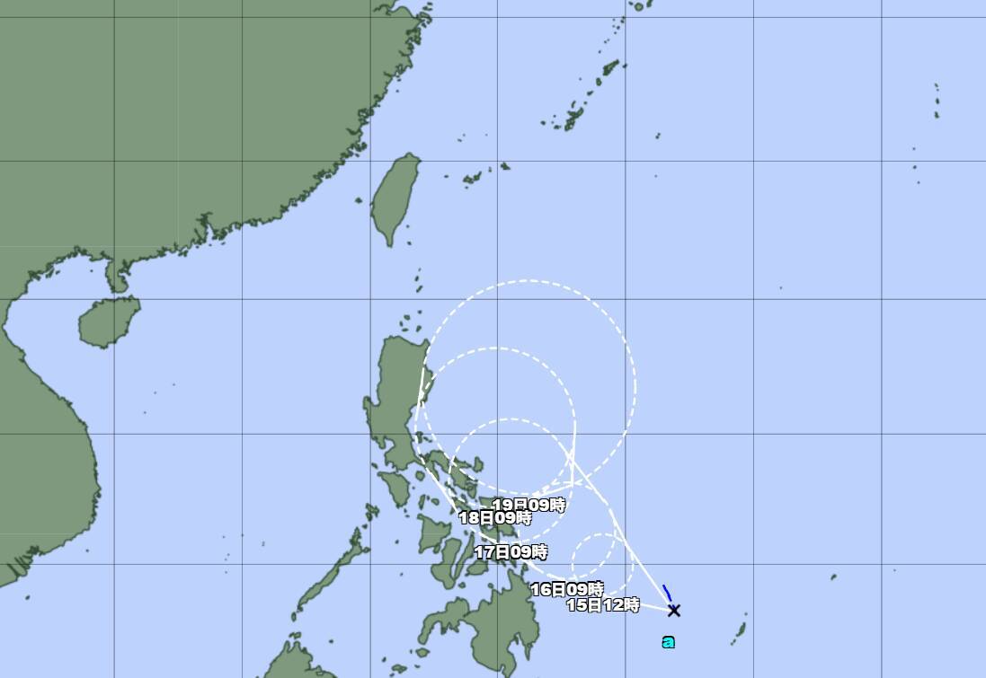 14日正午時点で中心の気圧は1004ヘクトパスカル、中心付近の最大風速は15メートル、最大瞬間風速は23メートル。19日にかけてフィリピンの東をゆっくりと北上する見込み。