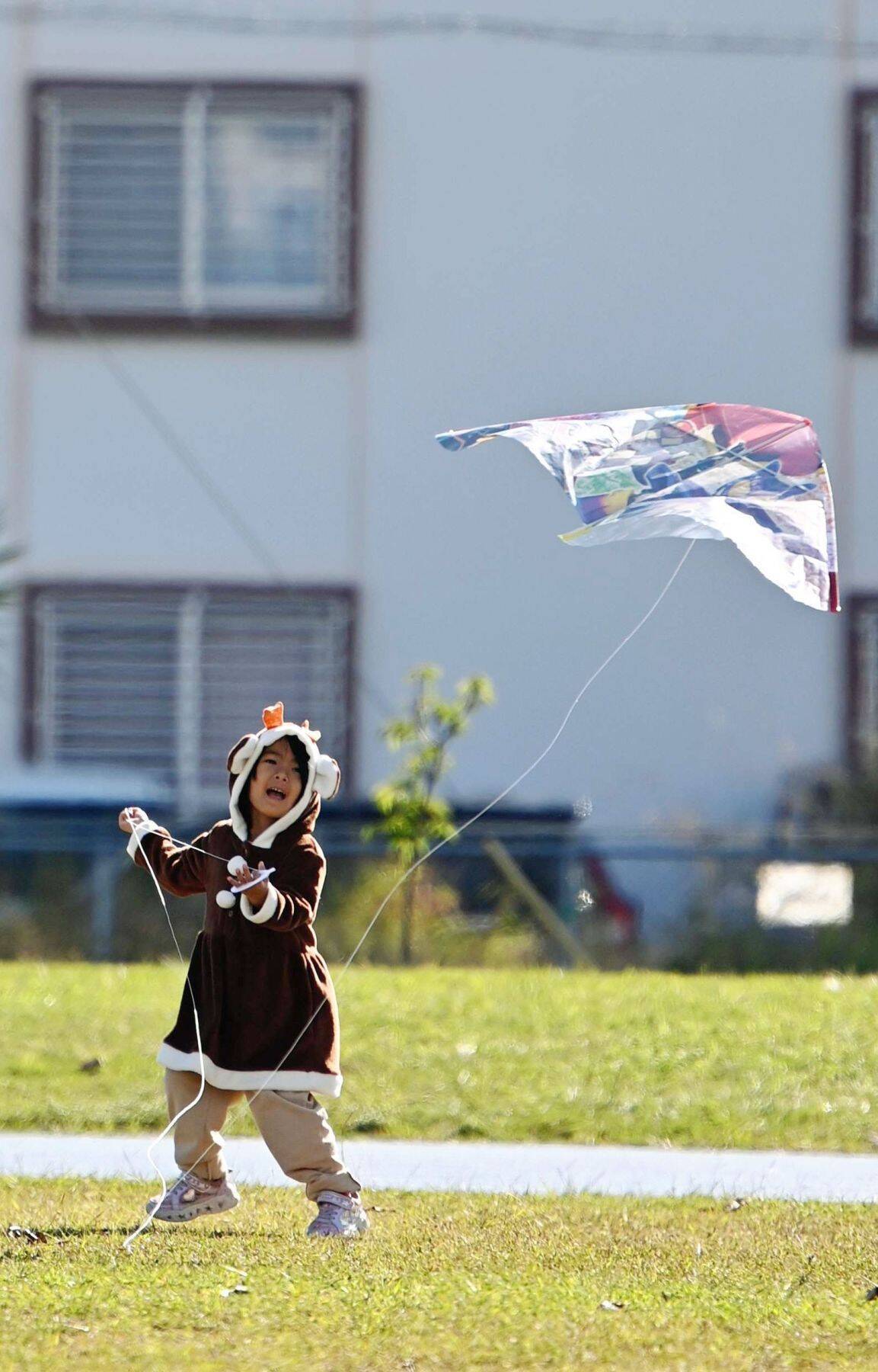 クリスマスの名残がお正月まで? たこ揚げをトナカイの格好で楽しむ女の子がほほ笑ましかったです=4日、与那原町・与那古浜公園(喜屋武綾菜撮影)