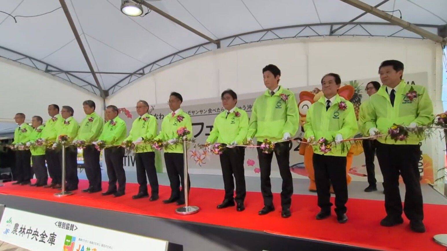 「おきなわ花と食のフェスティバル2026」の開会式でテープカットする参加者ら=24日、那覇市の沖縄セルラースタジアム那覇