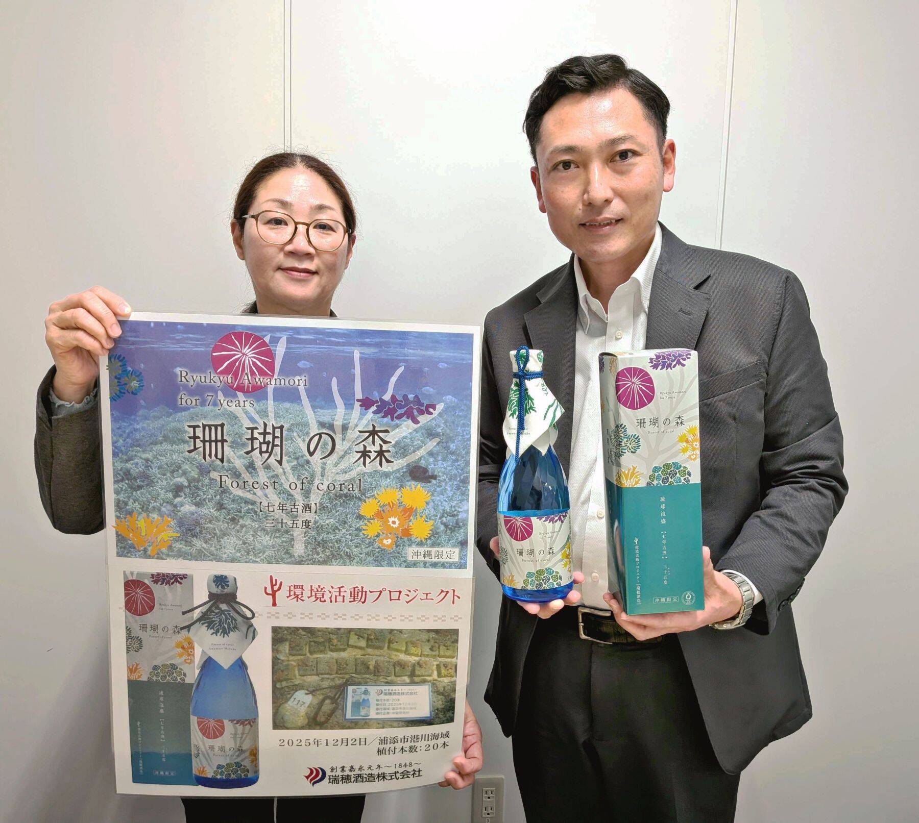 [企業短信] 瑞穂酒造はこのほど、浦添市港川でサンゴ20株を植え付けた。同社は2017年に発売した「琉球泡盛 珊瑚の森」(7年古酒、35度)の売り上げの一部をサンゴ植え付けに充てる環境活動を継続しており、今回で8回目、累計160株となった。