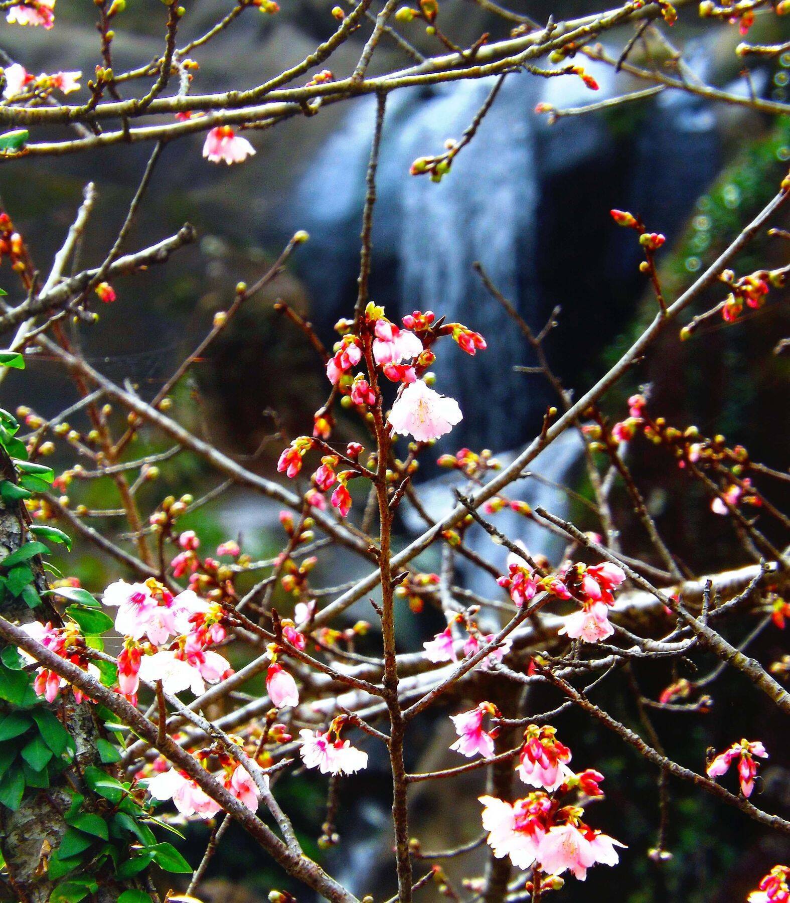 【名護】名護市数久田にある「轟の滝公園」でカンヒザクラ(バラ科)が開花しているのが27日、観察できた。そのうち、推定樹齢70年で高さ約8メートルの通称「御神サクラ」は滝と向かい合って咲き、ピンクの花越しに見る滝は幻想的だ。