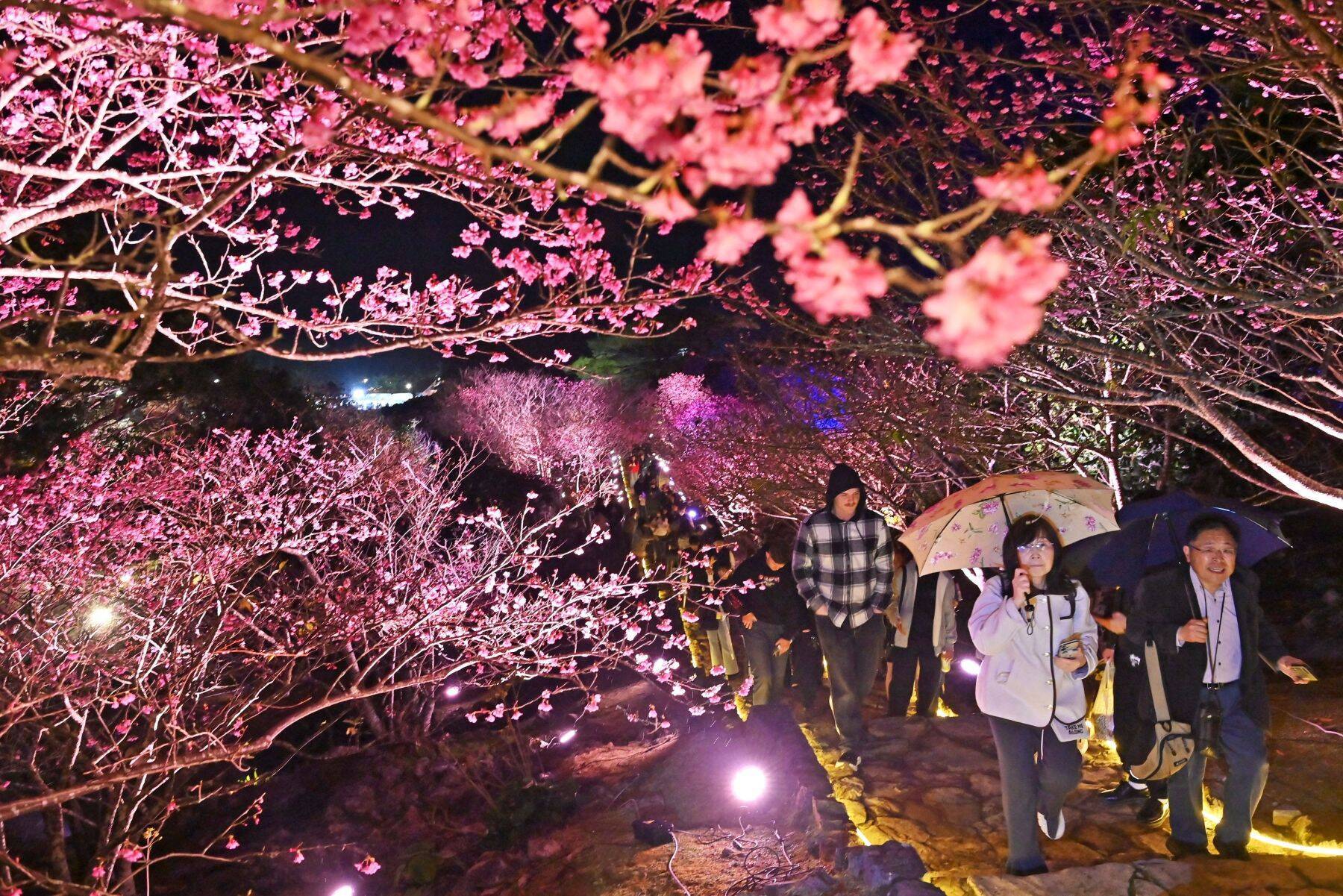 ライトアップされた幻想的な夜桜を楽しむ来場者=1月31日、今帰仁村・今帰仁城跡(金城健太撮影)">