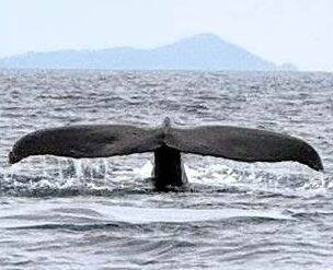 子どもたちは2隻に分かれて出港。座間味沖でザトウクジラが姿を現すと「すごい、すごい。見えた!」と歓声が上がった。初参加した小学3年の古波蔵喜一さんは「6回も見えて最高。来年もまた見たい」と冬の海での貴重な体験を喜んだ。航行中、普段陸地からは目にできない岩山に、ヤギの姿を見つけるなどの発見もあった。(山岡晴佳通信員)姿を見せたザトウクジラ">
