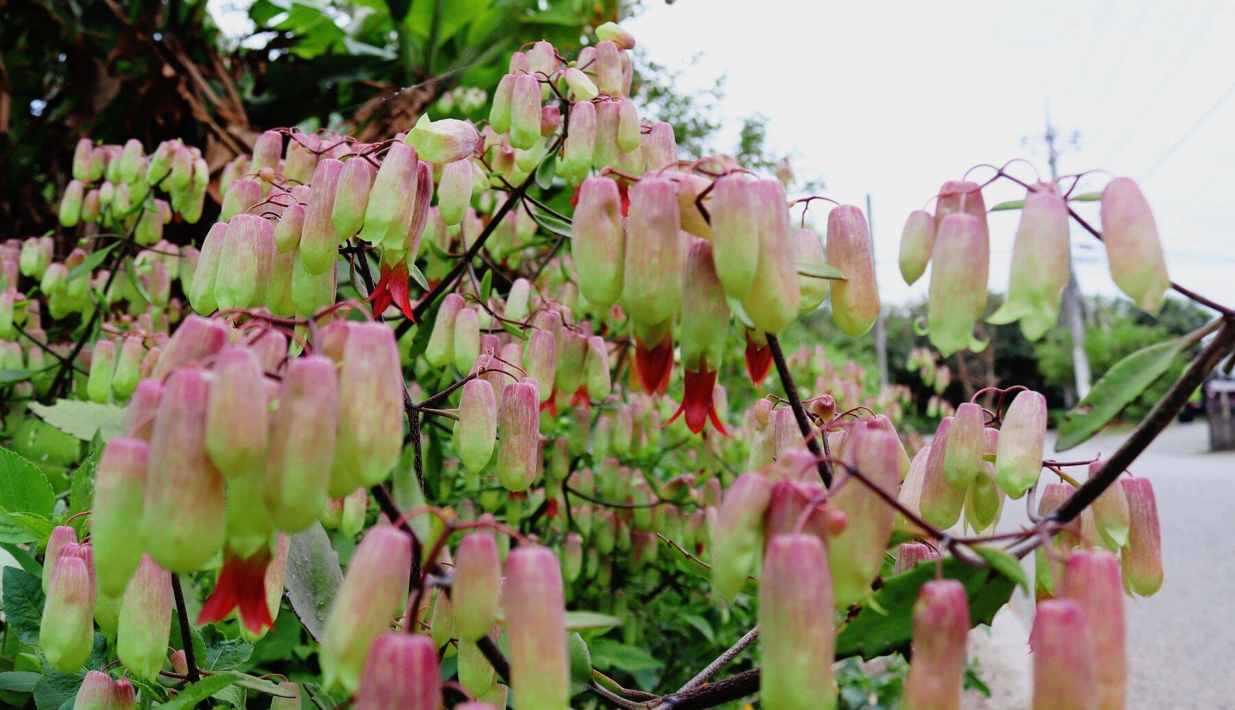 円筒形の緑色と紅色を帯びた花が下向きに咲くのが特徴。