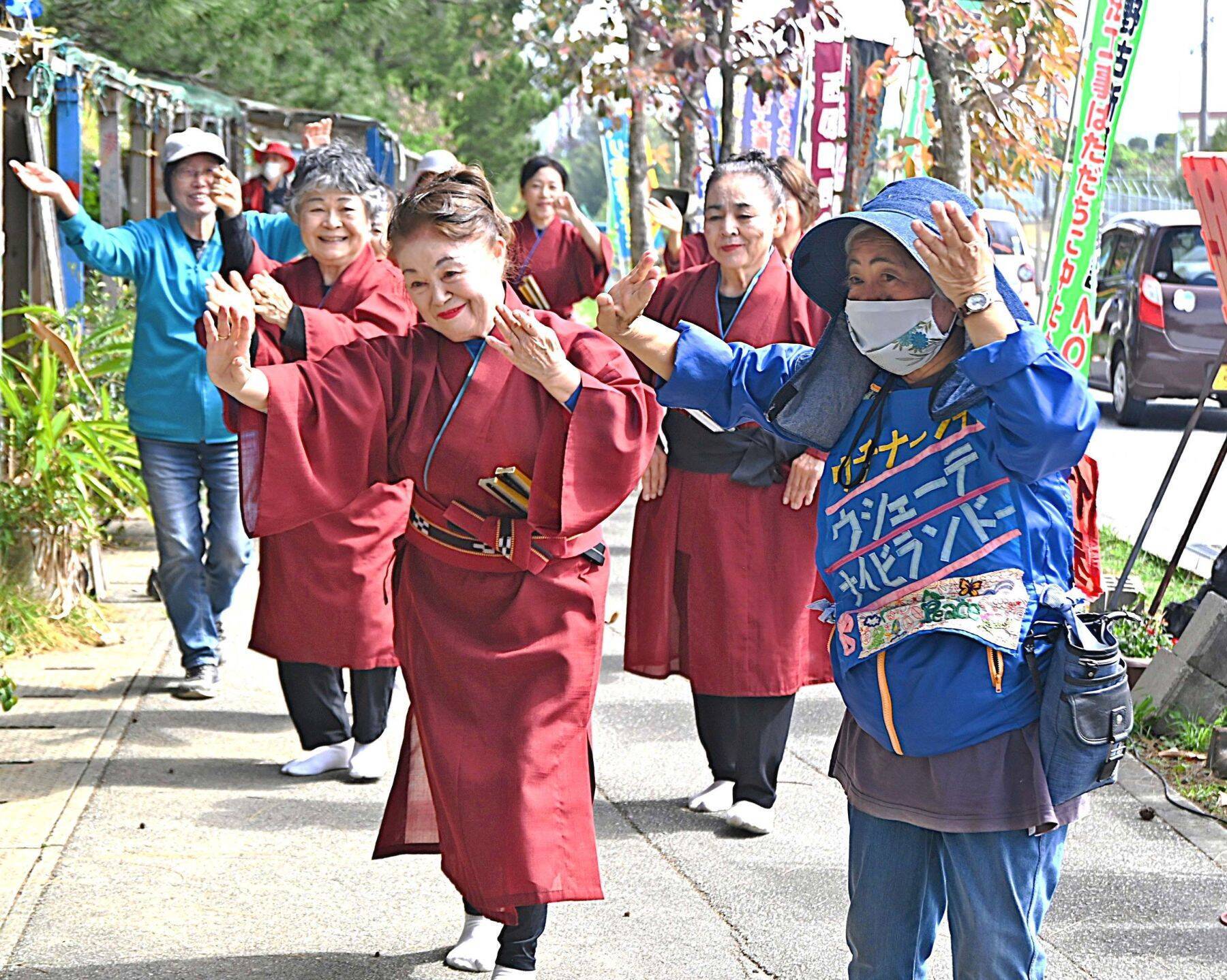 三線の音とともに「かぎやで風」「御縁節」「辺野喜節」を斉唱。