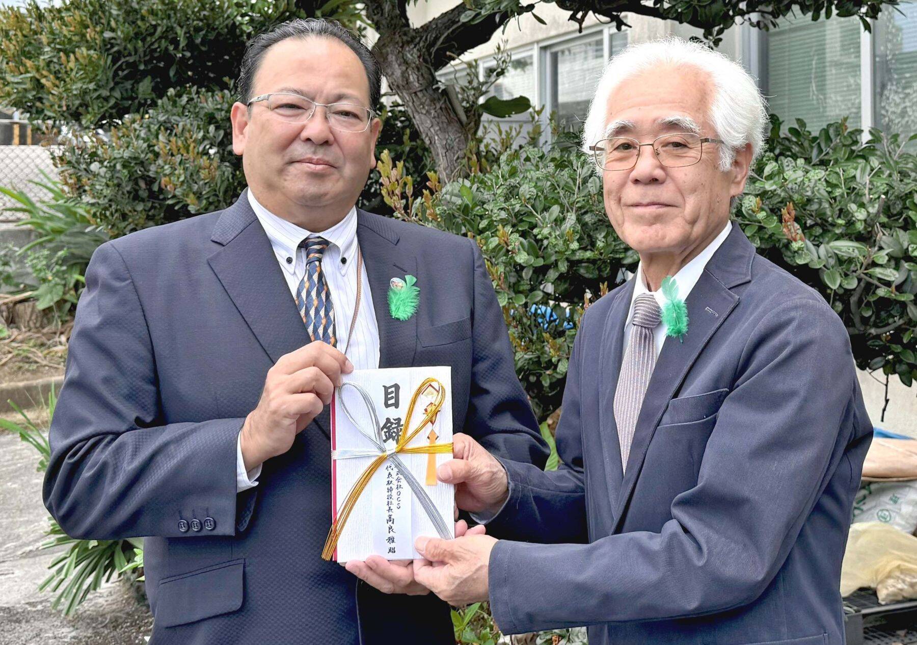 OCSの高良雅昭社長(左)から目録を受け取る県緑化推進委員会の上里均理事長(提供)