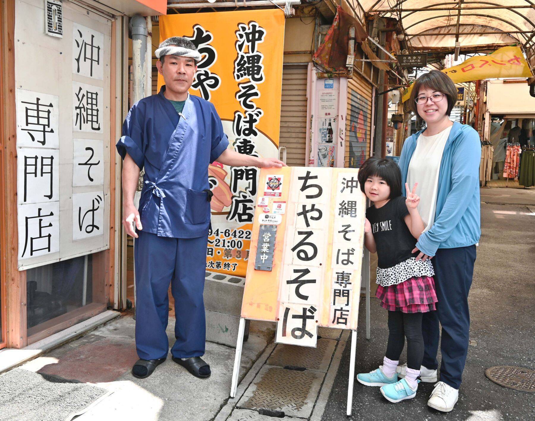 栄町市場内で店を構える店主の宮城春之さん(左)と妻の加七子さん(右)、娘の七華さん=11日、那覇市安里