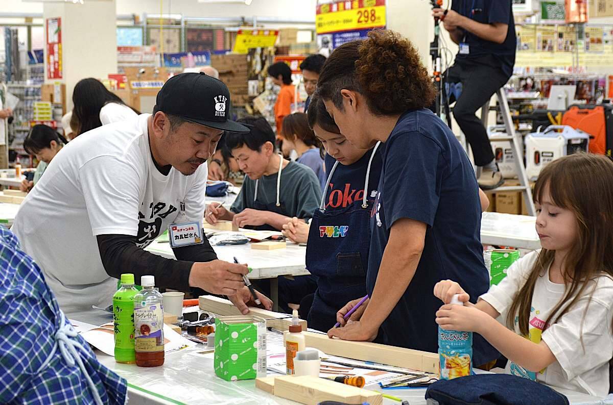 メイクマン公式アンバサダーのタイシロウさんの指導を受け、ウッドテーブルライトを作った名護市の渡具知さちよさん(70)は「いつもユーチューブを見ているタイシロウさんの講座に参加できてうれしい。大満足のライトが完成した」と笑顔。海レジンアートづくりに挑んだ浦添市の島袋叶彩(かなさ)ちゃん(5)は「青と緑の液体を混ぜてきれいな海をつくれた。早くおうちのテーブルに飾りたい」とうれしそうに話した。