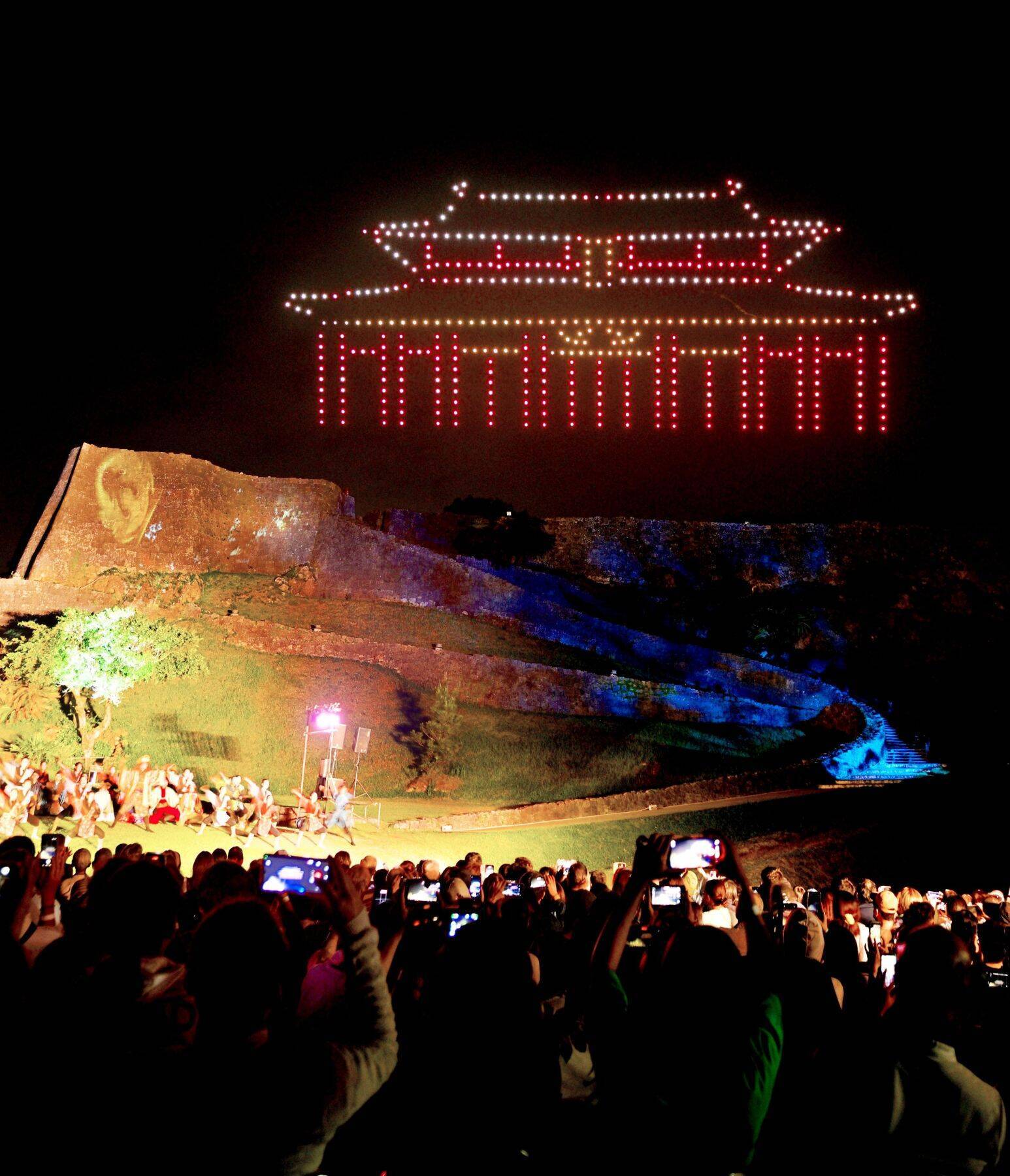 ライトアップされた勝連城跡をバックに、市内の中高生による現代版組踊「肝高の阿麻和利」のダイジェスト版が披露された。劇終了後、ドローンが飛び立ち、出演者の歌と踊りに合わせ、光の「勝連城」や文字などが浮かび上がった。