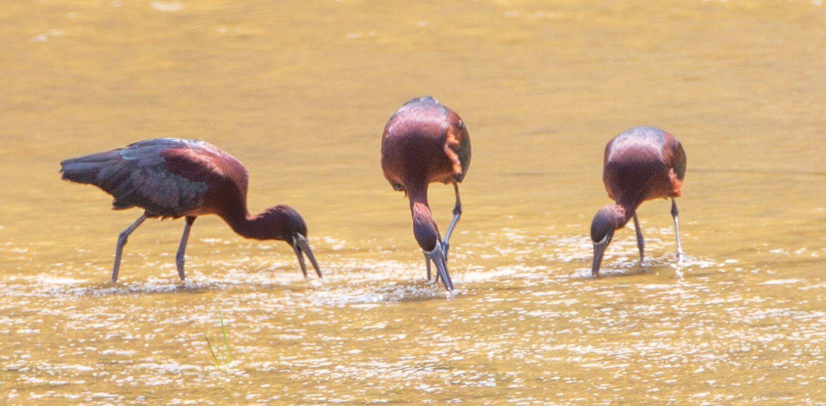 ブロンズトキは渡り鳥でオーストラリアや南アジアなど広範囲に生息する。仲地さんは「3羽は遠く離れずにいたので家族かもしれない。栄養を蓄えて繁殖地に旅立ってほしい」と願った。(宮古支局・又吉健次)