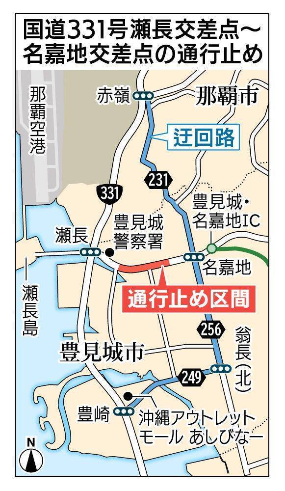 迂回(うかい)路として、県道231号赤嶺~名嘉地、県道256号、県道249号名嘉地~豊崎区間の利用を呼びかけている。
