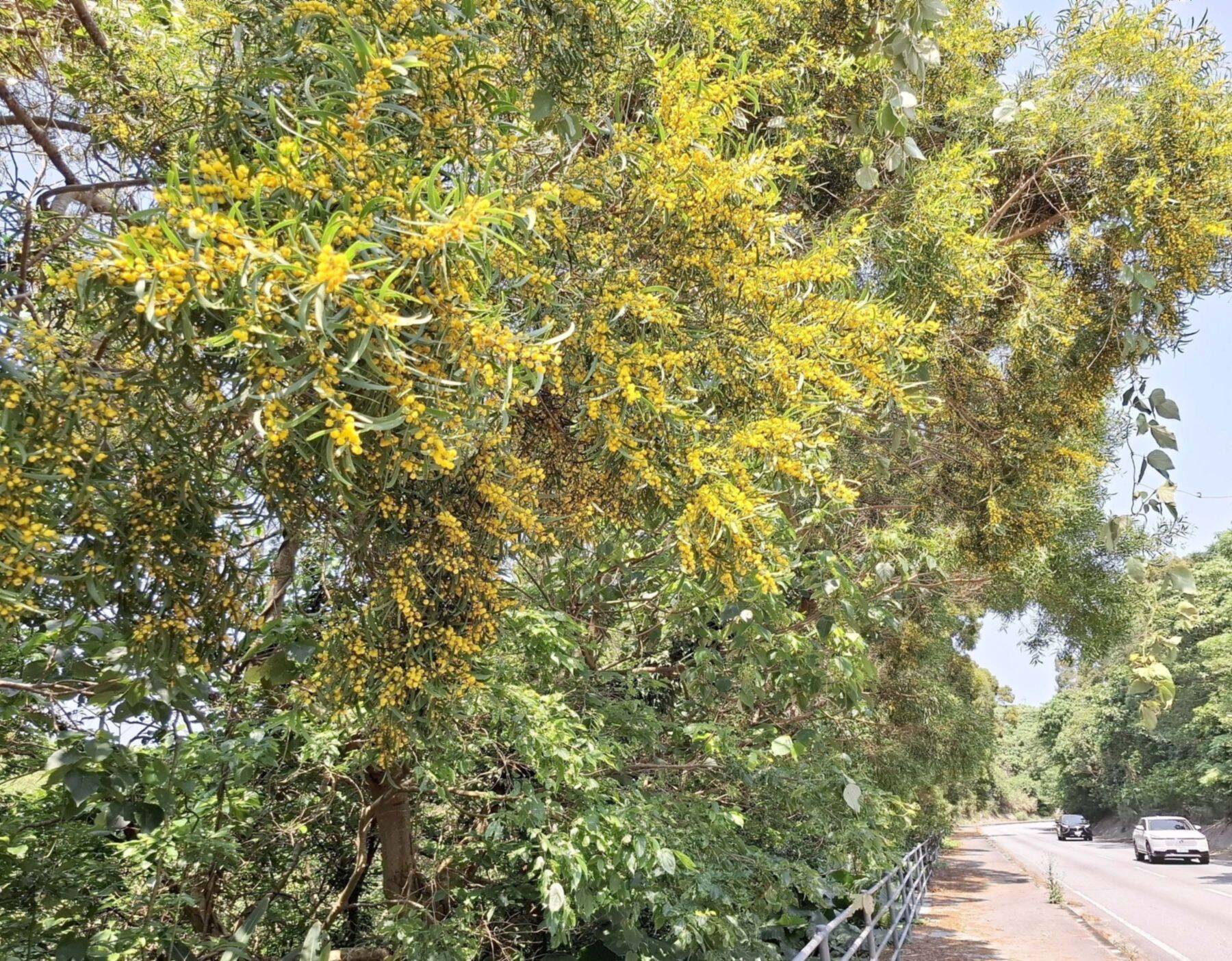 黄色い花を咲かせるソウシジュ=13日、名護市運天原