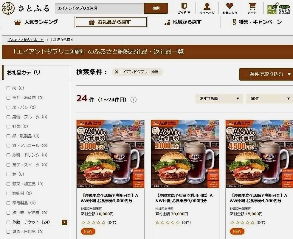 1万円、1万5千円、3万円の寄付に対し、返礼率は30%。返礼品に設定している自治体は那覇市、浦添市、名護市、糸満市、沖縄市、豊見城市、うるま市、北谷町、北中城村、与那原町。
