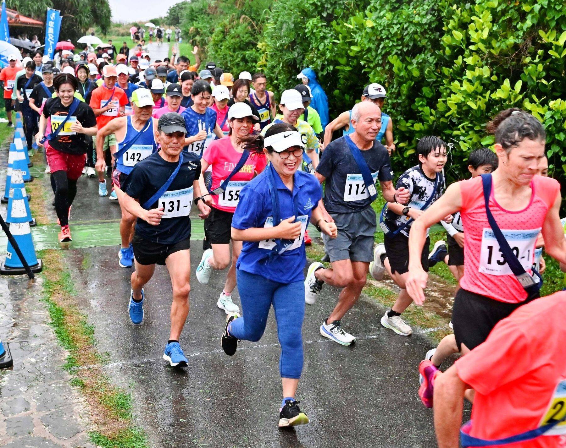 4区で追い付き、トップに躍り出た宜野湾陸友会Aの饒平名寛弥さん(24)は「後半にギアを上げて勝負を懸け、気力を振り絞った」と充実の表情で喜びを語った。2位は黄金森ランナーズwithARC・Aが56分3秒、3位はBTRC沖縄アスリートが59分12秒だった。(中部報道部・新里健)