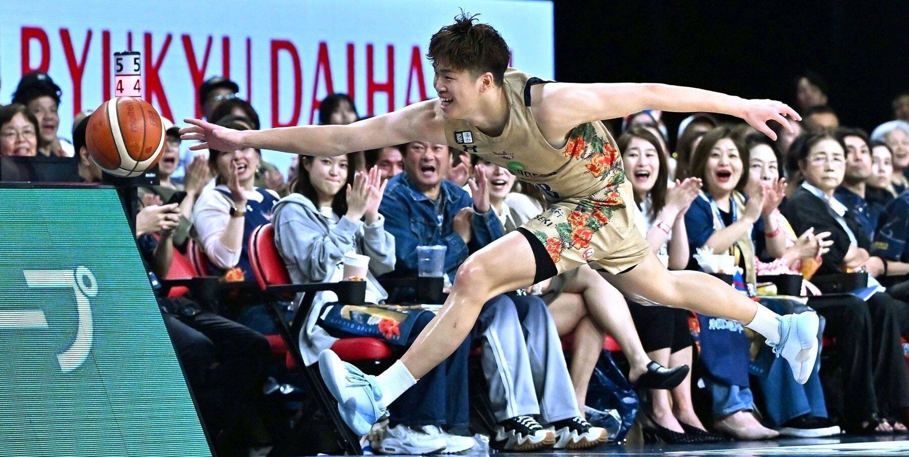 キングスの試合で脇真大がラインぎりぎりのボールを笑顔で追いかけ、まるで「大の字」=18日、沖縄サントリーアリーナ(喜屋武綾菜撮影)