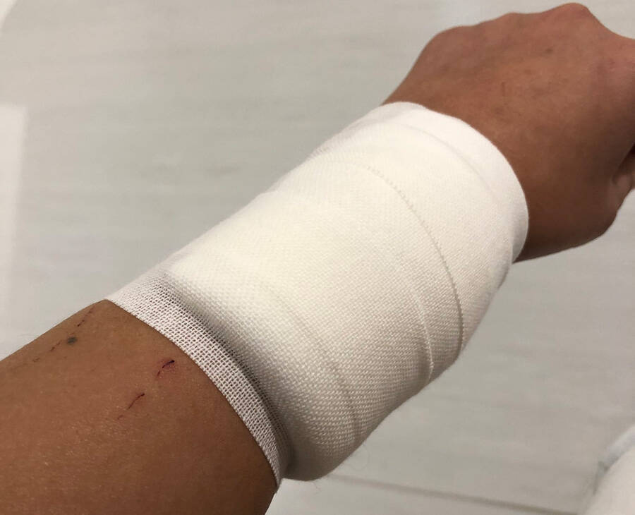 その頃には噛まれた箇所を中心にパンパンに腫れあがって強い痛み、熱感を伴っている状態。局所麻酔で噛まれた部分を中心に切開し、洗浄処置を行い、抗菌剤を処方され破傷風ワクチンを1回接種。その後は1か月後に2回目、1年後にもう1回の追加接種の完了をもって治療終了となる。現在は、傷跡は残っているものの、腫れと赤みが完全に引いている状態。