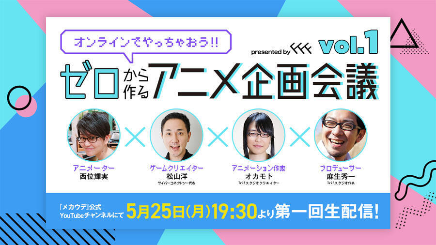 会議のもようは、第1回が5月25日19:30から21:30(終了予定)まで、クリエイティブチーム「TriFスタジオ」のオリジナルアニメ「メカウデ」の公式YouTubeチャンネルで配信されます。配信は隔週で全3回を予定。