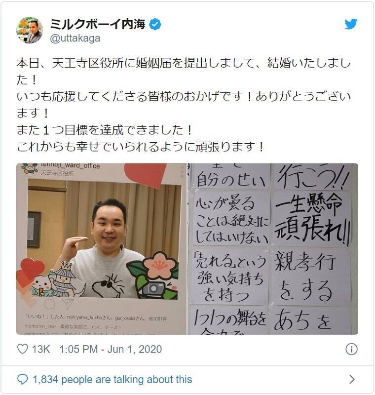これからも幸せでいられるように頑張ります! pic.twitter.com/bIptbi1k0l— ミルクボーイ内海 (@uttakaga) June 1, 2020