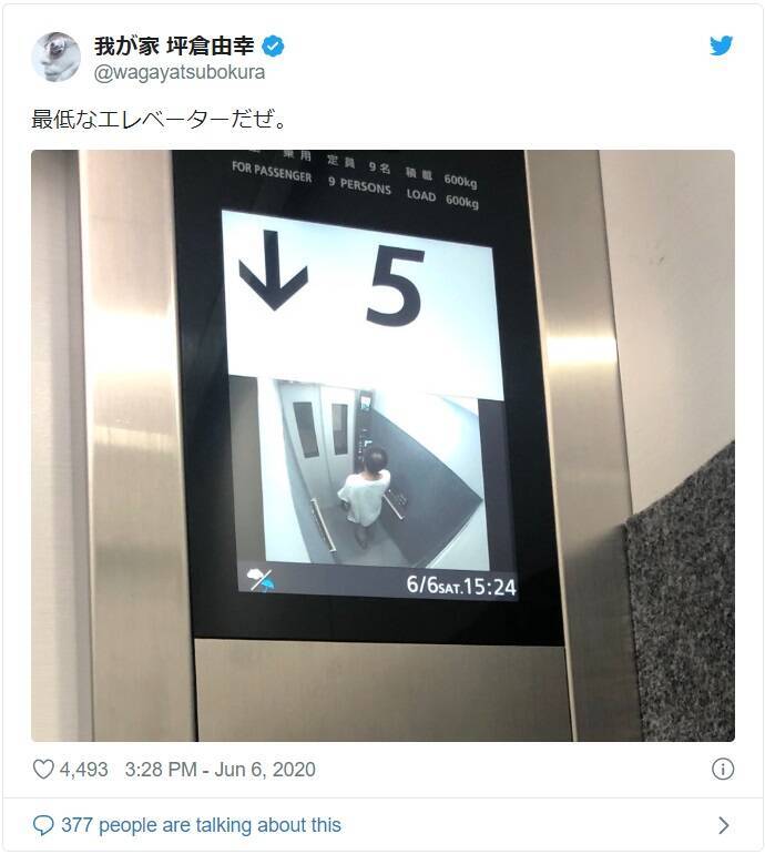 坪倉さんは6月6日、「最低なエレベーターだぜ」というコメントと共に、1枚の写真を投稿。そこに写っていたのは、エレベーターの防犯カメラに映っている自分の姿。そして、坪倉さんの頭頂部がハッキリ映し出されていました。あ、少し肌色が見える……。
