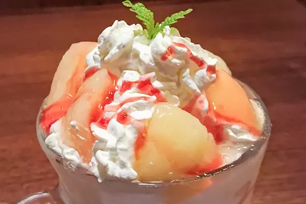 ボリューム満点のジョッキパフェのため、店員さんから「提供までに少し時間がかかります」と言われましたが、実際には思っていたほど待つことはありませんでした。運ばれて来たジョッキパフェは、ずっしりとしていて重量感がありましたが、ピーチの香りがほんのりして、溢れんばかりに盛られているピーチのコンポートがキラキラ輝き、「早く食べて~」と誘ってきているように見えます。それでは、いただきます!