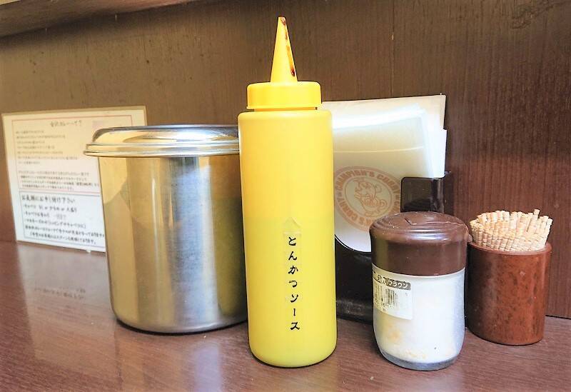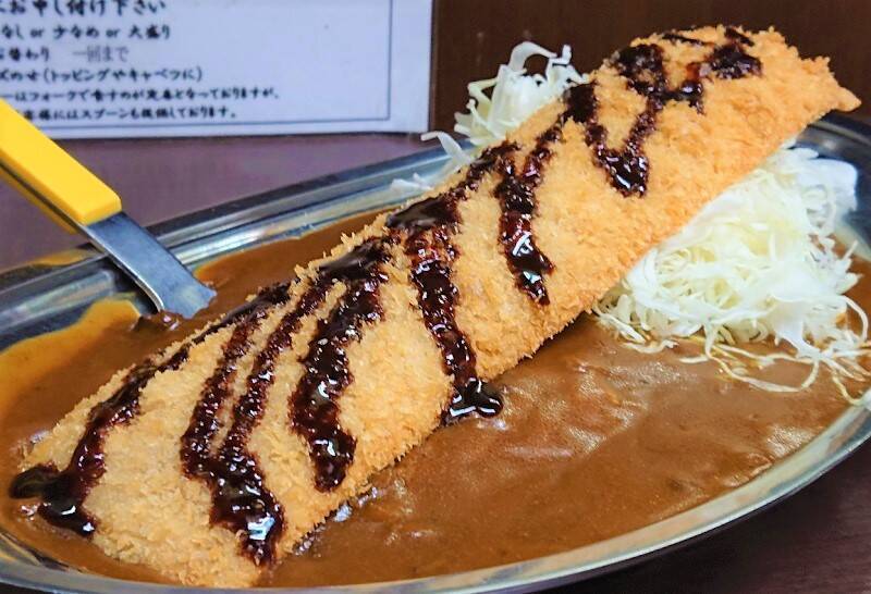 金沢カレーについて理解したところで、タイミングよく運ばれてきたのが、ビッグカツが中央に「ドーン!」と乗っていて、存在感がハンパない逸品。ビッグカツが滑り台のようになっています。そこに、とんかつソースをかけて、いただきます!