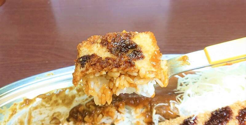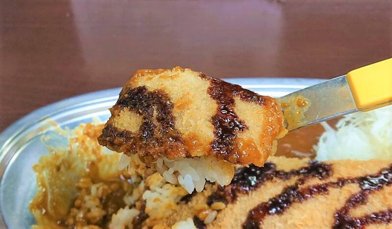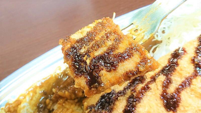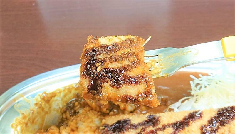 ビッグカツをフォークで切って(通常は切って盛り付けられていますが、店員さんに言えば切らずに盛り付けてくれます。今回は切らない方が「映える」かなぁ……と思って、切らずに盛ってもらいました)、ご飯と一緒にパクッ!
