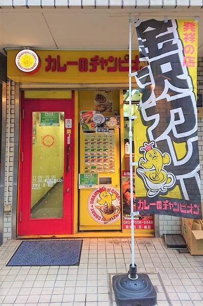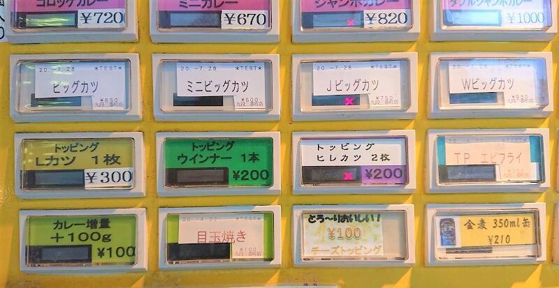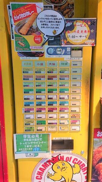 これぞ、まさしく嘘から出たまこと。カレーと駄菓子がどんなケミストリーを起こすのか、そもそも美味しいのか、期待と不安を抱きながら、小雨がぱらつく中、お店に向かいました。到着すると、お店の前には金沢カレーのノボリがはためき、入口付近にある食券販売機の上部には「ビッグカツカレー」(650円/税込)のチラシが貼られていました。