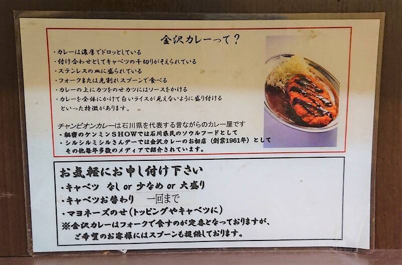「ビッグカツカレー」の食券を買って店内に入り、店員さんに食券を渡して席に着きました。席には金沢カレーについての説明が貼ってあったので、待っている間に金沢カレーについてお勉強……。