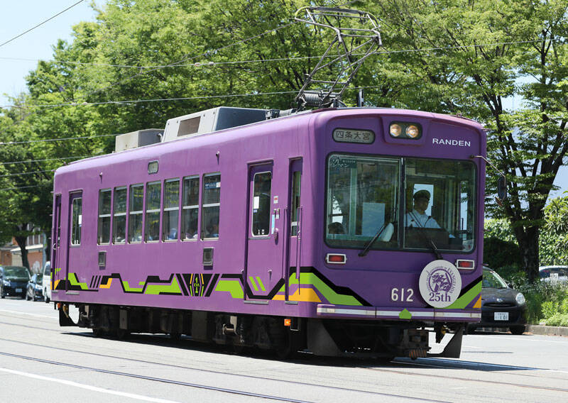 京都市中心部の四条大宮から観光地嵐山を結ぶ京都唯一の路面電車「嵐電」では、「エヴァンゲリオン京都基地」のオープンにあわせてコラボレーションを実施。