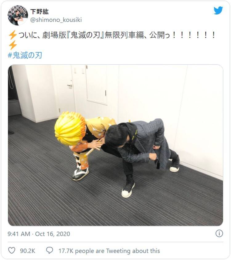 ついに!2020年10月16日、「劇場版『鬼滅の刃』無限列車編」が公開。超人気漫画の劇場版が公開されたとあって、ネット上では多くの「鬼滅の刃」ファンが盛り上がっています。そんな中、声優の下野紘さんが自身が声を担当している「鬼滅の刃」の人気キャラクター・我妻善逸と、雷の呼吸をしている写真を公開し、話題になっています。