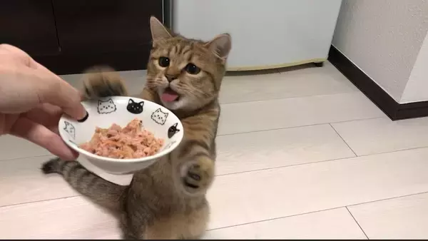 どうやらこの日のごはんは「猫缶」のようですが、もうすぐ生後6か月という子猫なみにらくんにとっては、実はこれがはじめて。飼い主さんが器を近づけた瞬間、「ニャンだこれは!?」と言わんばかりに一気にハイテンションに。思わず立ち上がって、器を覗き込んでしまっているんです。
