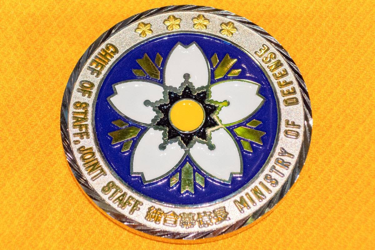 日本の自衛隊でも、主に贈答用としてチャレンジコインが作られ、防衛外交の一環として渡されています。自衛隊の制服組トップである統合幕僚長のチャレンジコインは、桜が大きくデザインされたもの。裏側には日本周辺の地図と、統合幕僚長の名前が英語で記されています。