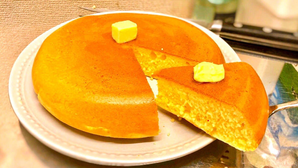 フライパンの底になっている部分に焼き目がついたら出来上がりです。バターやメイプルシロップ、アイスクリームやホイップクリームなど、通常のホットケーキのようにお好みのものを載せていただきましょう。