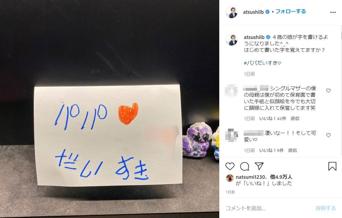 淳さんは1月11日、「4歳の娘が字を書けるようになりました」というコメントと共に、1枚の写真を投稿。写真には、ハート付きで「パパだいすき」と書かれた娘さんからの手紙が写っていました。淳さんは笑った顔文字も添えて喜びを表現していますが、これは自然と笑顔になってしまいますね。