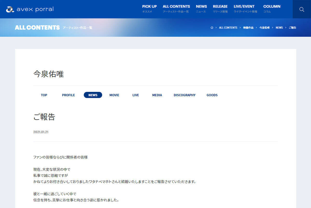 今泉さんは1月21日、所属事務所を通して発表をしており、「現在、大変な状況の中で私事で誠に恐縮ですが かねてよりお付き合いしておりましたワタナベマホトさんと結婚いたしますことをご報告させていただきます」とコメント。また「現在お腹の中に愛おしい命を授かっており、出産は暖かい時期を予定しております」と妊娠していることを明かしている。