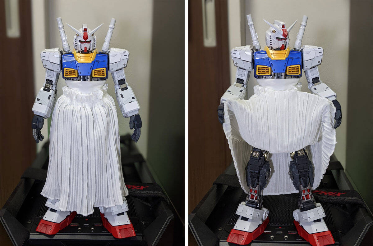 それをドールたちに着用かと思いきや、“ピコーンと閃き”、年始から組み立てていた「PGUガンダム」こと、2020年12月に玩具メーカーのバンダイより発売された「PG UNLEASHED RX-78-2 ガンダム」に「着用」させたというのが事の経緯でした。