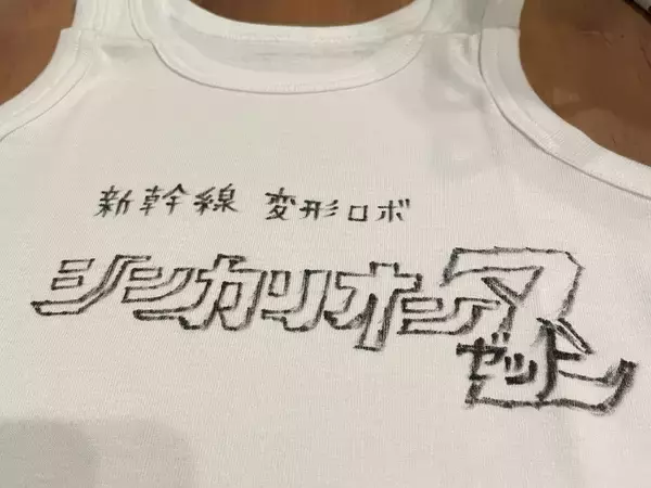 4歳の息子さんに頼まれて無地のタンクトップに書いた「新幹線変形ロボ シンカリオンZ」の文字。しかし手書きのせいか「うすた京介」先生感が漂ってしまっています……。作品に出てきてもおかしくないほどの「マサルさんっぽさ」。