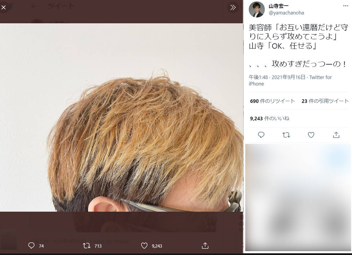 山寺さんは9月16日、自身のTwitterに『美容師「お互い還暦だけど守りに入らず攻めてこうよ」山寺「OK、任せる」』と綴り1枚の写真を投稿。そこには山寺さんのトレードマークともいえるポップなメガネが見切れた横からのショットに、しっかりと明るい金色に染まった髪の毛がおさめられています。