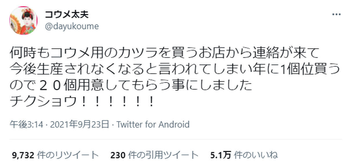 コウメ太夫さんは9月23日、自身のTwitterに「何時もコウメ用のカツラを買うお店から連絡が来て今後生産されなくなると言われてしまい年に1個位買うので20個用意してもらう事にしました」と報告。続けて、自身の持ちギャグである渾身の「チクショウ!!!!!!」を投稿しました。