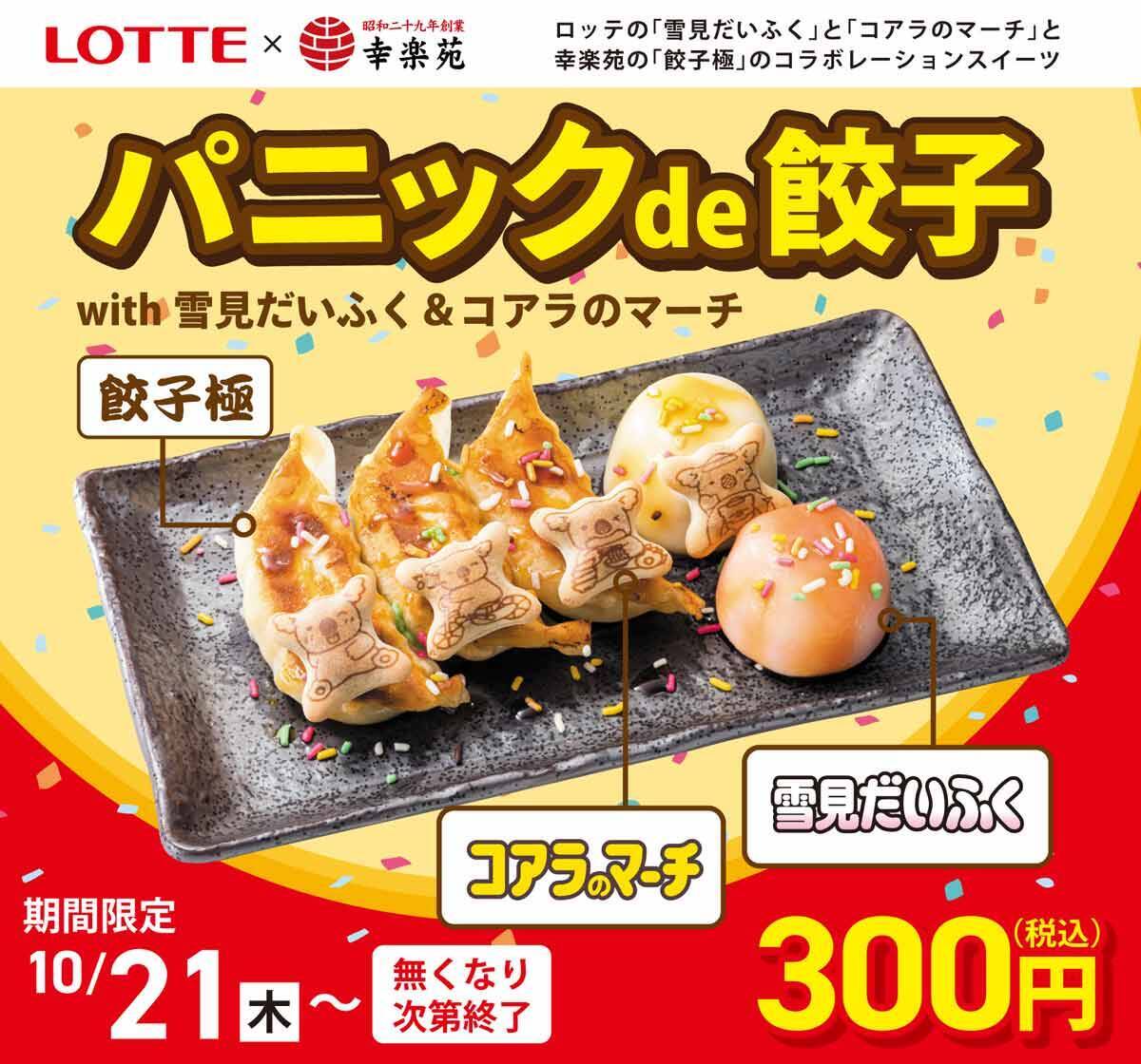 ラーメンチェーン「幸楽苑」が、ロッテがコラボレーションした新商品を10月21日に発売しました。商品名は「パニックde餃子with雪見だいふく&コアラのマーチ」。