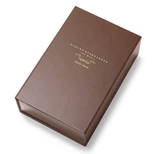 どちらもヴァイオレットのトランクケースをイメージしてつくられたシューズボックスに入れられています。アンティークなブラウンに金色の箔押しが施された高級感溢れるボックスの中には、ヴァイオレットのイラストとすみれの花が描かれています。