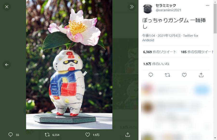 そんなスタイリッシュなガンダムと一線を画す、衝撃的な見た目の「陶器のガンダム」がツイッターで話題になっています。かわいらしいぽっちゃりとした体型に、一輪挿しの花瓶らしく、花が生けられている姿がなんともシュール。どこか哀愁すら感じさせる作品です。