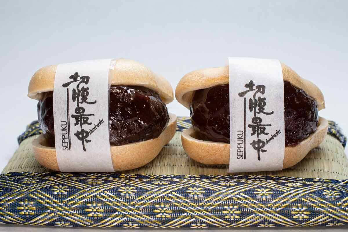 この事件をモチーフに創作された和菓子が「切腹最中」。表と裏の最中皮が接する部分を腹に見立て、そこが開いてはみ出るくらいの餡を詰めたものです。