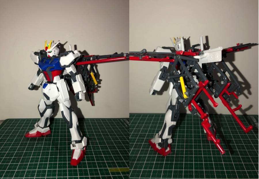 本当はシールドも作りたかったそうですが……赤いランナーが足りず惜しくも断念。とはいえだれがどう見ても「エールストライク」に見える素晴らしい出来栄えの作品となりました。