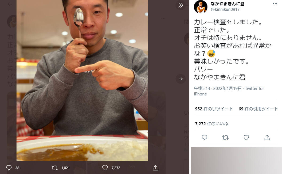 なかやまきんに君の1月19日のTwitter投稿では、カレーを食べるシーンを紹介しています。しかしながら、食べるとは言わずに「カレー検査をしました。正常でした」と表現。つづけて「オチは特にありません」と綴っていますが、「パワー なかやまきんに君」といつものギャグで締めています。