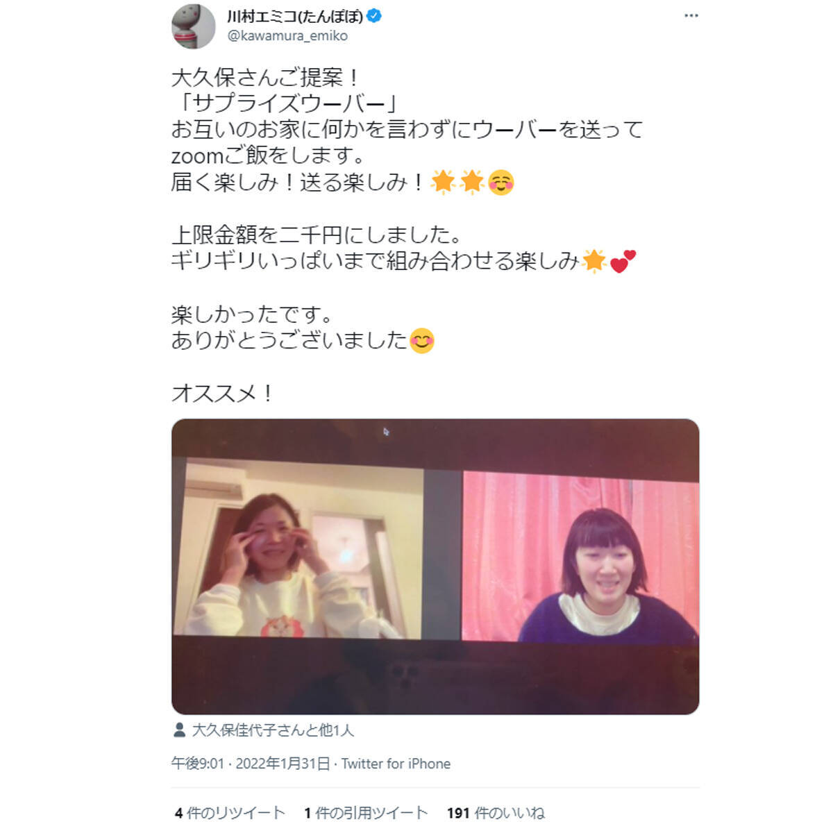 川村さんは写真について、「大久保さんご提案!「サプライズウーバー」お互いのお家に何かを言わずにウーバーを送ってzoomご飯をします。届く楽しみ!送る楽しみ!」と説明すると、「上限金額を二千円にしました。ギリギリいっぱいまで組み合わせる楽しみ 楽しかったです。ありがとうございました オススメ!」と笑顔やハートの絵文字たっぷりにその魅力をアピール。