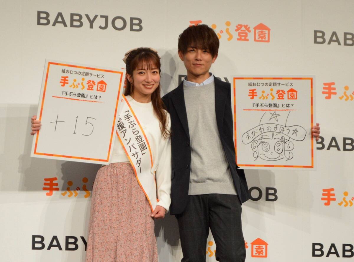 保育所向け紙おむつのサブスクサービス「手ぶら登園」のPRイベントが、2月22日に開催されました。先日、「手ぶら登園」の応援アンバサダーに就任したばかりの辻希美さん、さらに応援サポーターとして夫の杉浦太陽さんも登場しました。