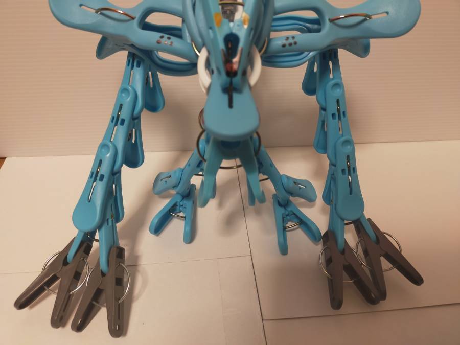 よく見ると、胴体部分に違う種類の洗濯バサミが用いられているのもポイント。洗濯バサミストとしての知識と経験に基づいた、さまざまなこだわりが詰まった作品となっています。